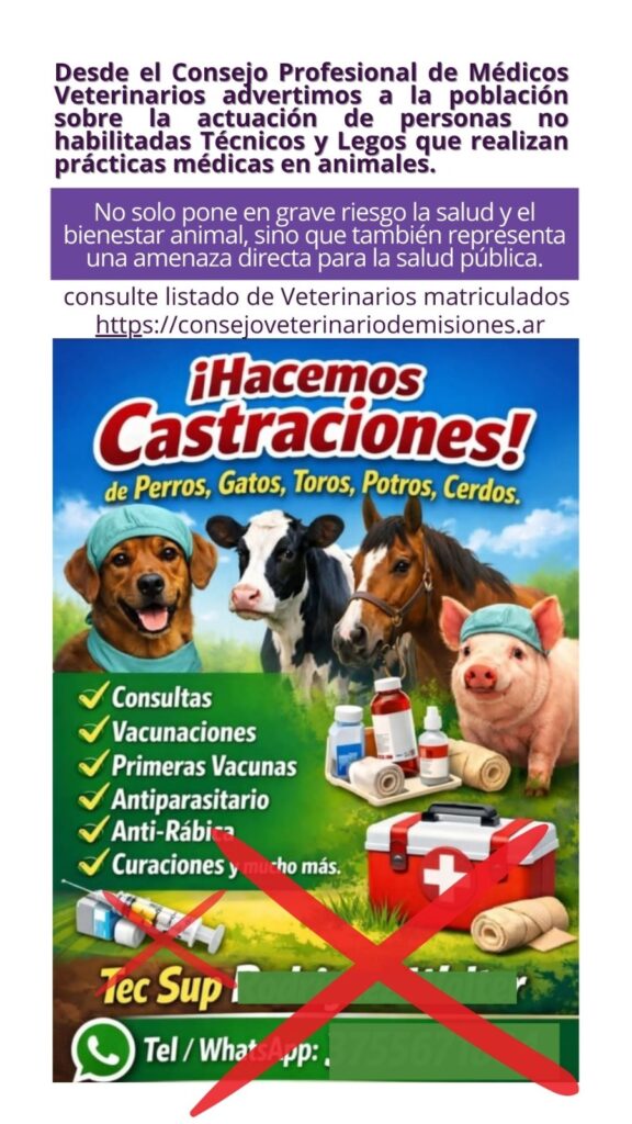 También se hizo plena difusión tanto a nivel de las redes del consejo como así también a distintos medios periodísticos donde se alerta a la población acerca de los riesgos que implica que una persona no capacitada y que no es profesional veterinario realicen prácticas sobre los animales recordamos que es de consulta pública el listado de Los profesionales habilitados a ejercer la profesión en el ámbito provincial como así también los establecimientos habilitados para la venta de productos zooterápicos.